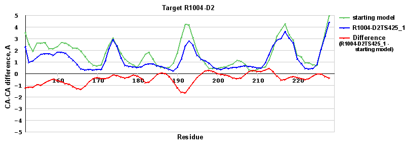 | Red line = (blue line) - (green thick line): difference between the corresponding Refined Model-Target and Starting Model-Target CA-CA distances (see above). Negative values show regions where the reifned model has better fit to the target than the starting model, i.e. areas of potential improvement. |