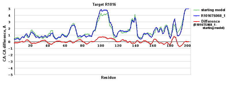 | Red line = (blue line) - (green thick line): difference between the corresponding Refined Model-Target and Starting Model-Target CA-CA distances (see above). Negative values show regions where the reifned model has better fit to the target than the starting model, i.e. areas of potential improvement. |