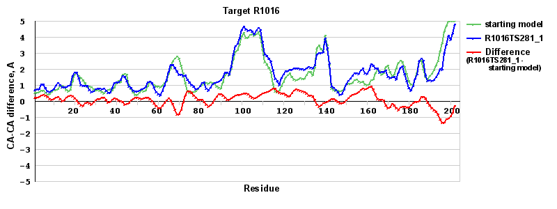 | Red line = (blue line) - (green thick line): difference between the corresponding Refined Model-Target and Starting Model-Target CA-CA distances (see above). Negative values show regions where the reifned model has better fit to the target than the starting model, i.e. areas of potential improvement. |