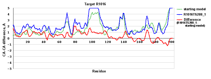 | Red line = (blue line) - (green thick line): difference between the corresponding Refined Model-Target and Starting Model-Target CA-CA distances (see above). Negative values show regions where the reifned model has better fit to the target than the starting model, i.e. areas of potential improvement. |