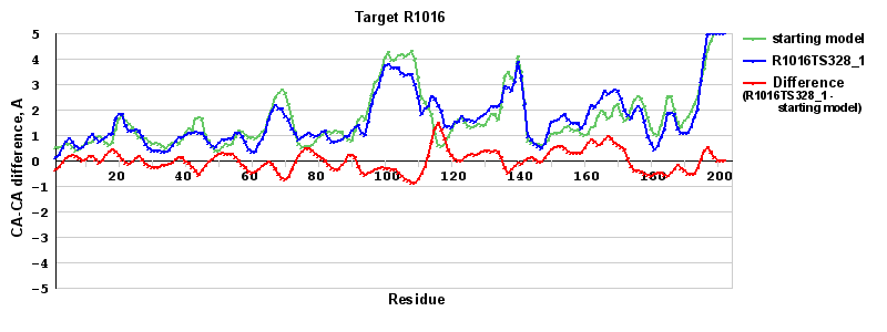 | Red line = (blue line) - (green thick line): difference between the corresponding Refined Model-Target and Starting Model-Target CA-CA distances (see above). Negative values show regions where the reifned model has better fit to the target than the starting model, i.e. areas of potential improvement. |