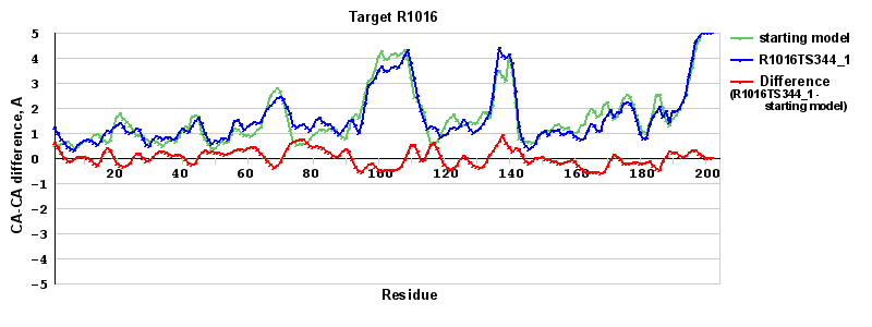 | Red line = (blue line) - (green thick line): difference between the corresponding Refined Model-Target and Starting Model-Target CA-CA distances (see above). Negative values show regions where the reifned model has better fit to the target than the starting model, i.e. areas of potential improvement. |