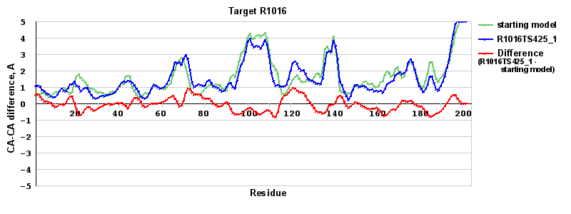 | Red line = (blue line) - (green thick line): difference between the corresponding Refined Model-Target and Starting Model-Target CA-CA distances (see above). Negative values show regions where the reifned model has better fit to the target than the starting model, i.e. areas of potential improvement. |